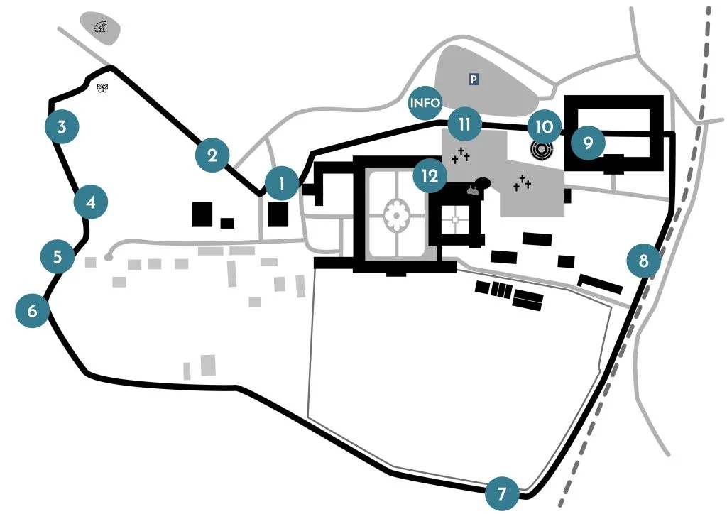 - Wegverlauf: Vom Parkplatz führt er in westlicher Richtung vorbei an Jugendherberge und Gemeinschaftsgarten, quert dann die Erlebnisbiotope und eine Wiese. Entlang der Klostermauer geht es neben dem Bahngleis zurück. Danach verläuft er durch den Maierhof und folgt dem Meditationsgarten und der Friedhofsmauer bis zur Basilika.