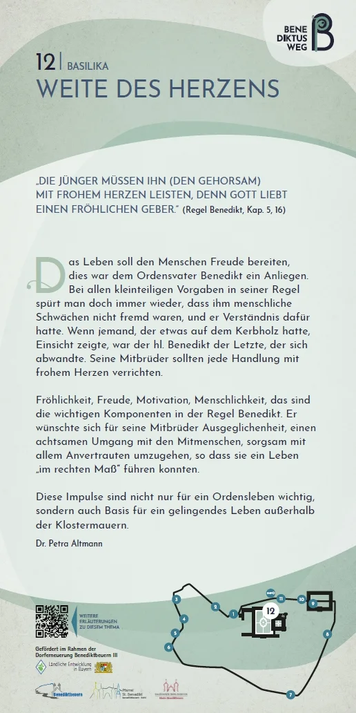Diese harten Streckenabschnitte zu bewältigen, gehört zum klösterlichen Lebenslauf: „Nicht in der ersten Begeisterung für das Mönchsleben, sondern durch Bewährung im klösterlichen Alltag und durch die Hilfe vieler hinreichend geschult, haben sie gelernt, gegen den Teufel zu kämpfen.“ (Regel Benedikt, Kap. 1, 3f.) Dies ist im Ordensleben übrigens nicht anders als im Alltag außerhalb der Klostermauern. Benedikt meint, dass der Weg des Heils zu Beginn eng sein muss. Nur wer bereit ist, durch diese Phase der Enge zu gelangen, wird auf den rechten Weg finden. Voller Zuversicht sagt er am Ende des Prologs zu seiner Regel: „Wer aber im klösterlichen Leben und im Glauben voranschreitet, dem wird das Herz weit, und er läuft in unsagbarem Glück der Liebe den Weg der Gebote Gottes.“ (Regel Benedikt, Prolog 49)