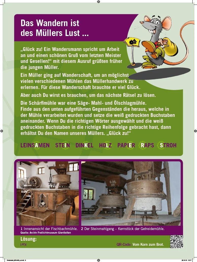Das Kernstück einer Getreidemühle ist der Steinmahlgang. Dieser besteht aus einem fest verankertem Bodenstein und einem zweiten Mühlstein, den sogenannten "Läuferstein", der frei darüber läuft. Er wird durch das Wasserrad angetrieben. Durch einen Trichter wird das Getreide in den Mahlgang geschüttet. Die Müller haben dazu gesagt: "Der Mahlgang wird durch das Steinauge des Läufersteins beschickt". Zwischen den Mahlsteinen wird das Korn nun zermahlen. Mit einem feinmaschigen Sieb werden die groben Körner (der Gries) und die Kleie (die Schalen des Kornes) vom Mehl getrennt. Das Mehl wird in einem Mehlkasten aufgefangen. Von dort kann es in Beutel verpackt und zum Bäcker transportiert werden. Daraus macht er dann leckeres Brot und Gebäck.