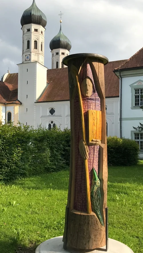 Der Auftrag an mich war, für den Benediktusweg eine Benediktusskulptur als Anfangs- und Endpunkt aus einem heimischen Eschenstamm zu schaffen. Die barocke Klosteranlage mit seiner Basilika und die wunderbare Landschaft haben mich zu einer schlichten, kompakten Form inspiriert, die in Kontrast zur Umgebung steht. Der Stamm zeigt den lebensgroßen Heiligen als jungen Mann mit Kapuze in einfachem Mönchsgewand und Abtsstab, geöffnetem Buch mit der Inschrift ORA ET LABORA und einem Raben zu seinen Füßen.